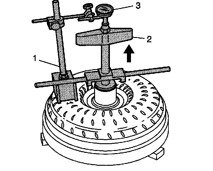 2. Install the J J 26900-13 (1), J 45051 (2) and J 8001 (3) onto the torque converter.