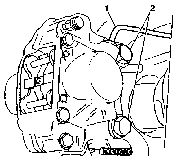 1. Remove the disc brake caliper bolts (2). Refer to Brake Caliper Replacement - Rear.