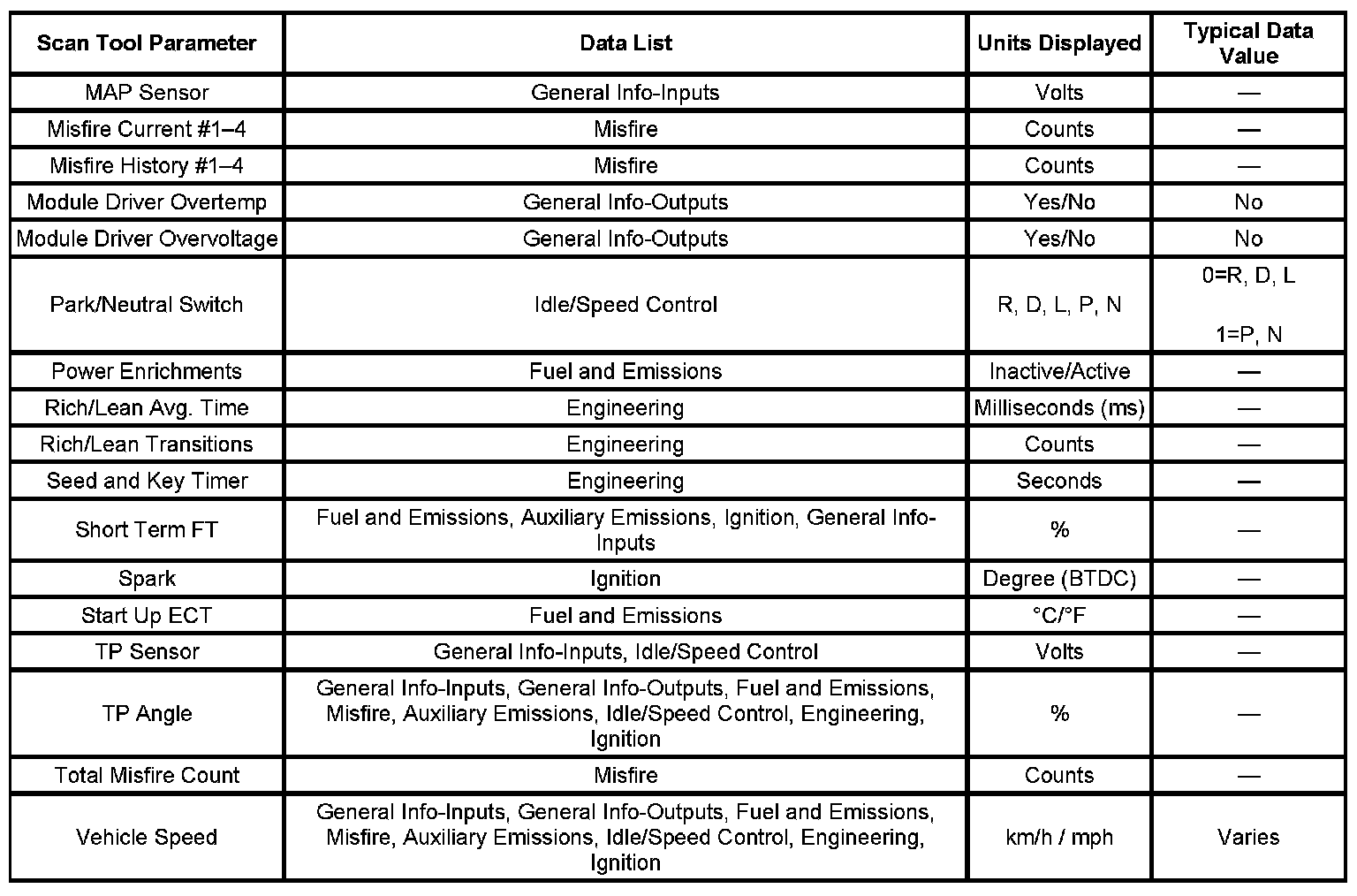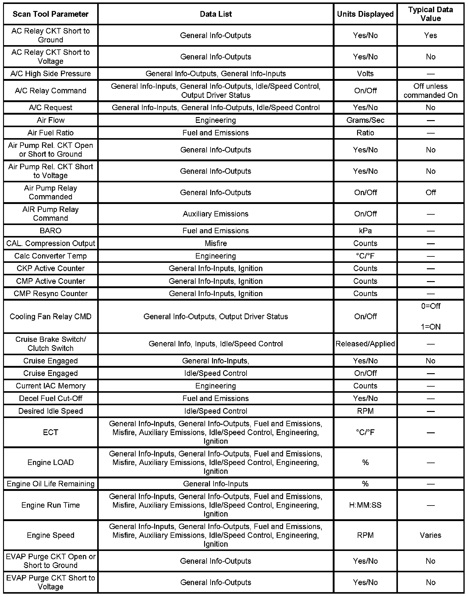 The engine Scan Tool Data List contains all engine related parameters that are available on the scan tool. The list is arranged in alphabetical order. The parameters in the Typical Scan Data values column represent values that would be seen on a normally running engine.