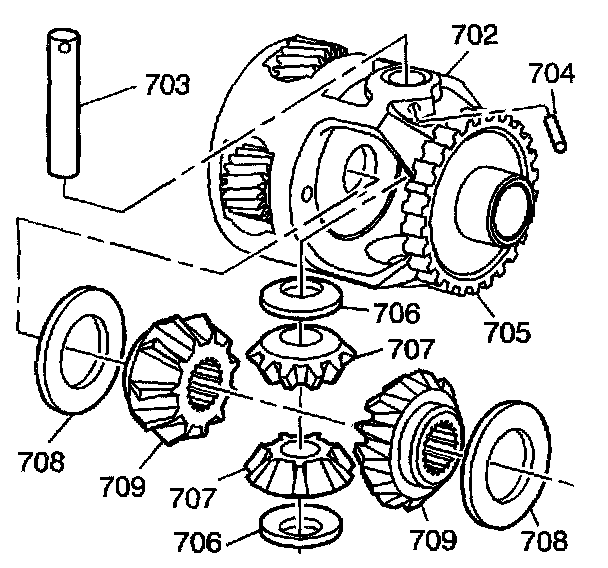 6. Remove the differential pinion gears (707) and the thrust washers (706).