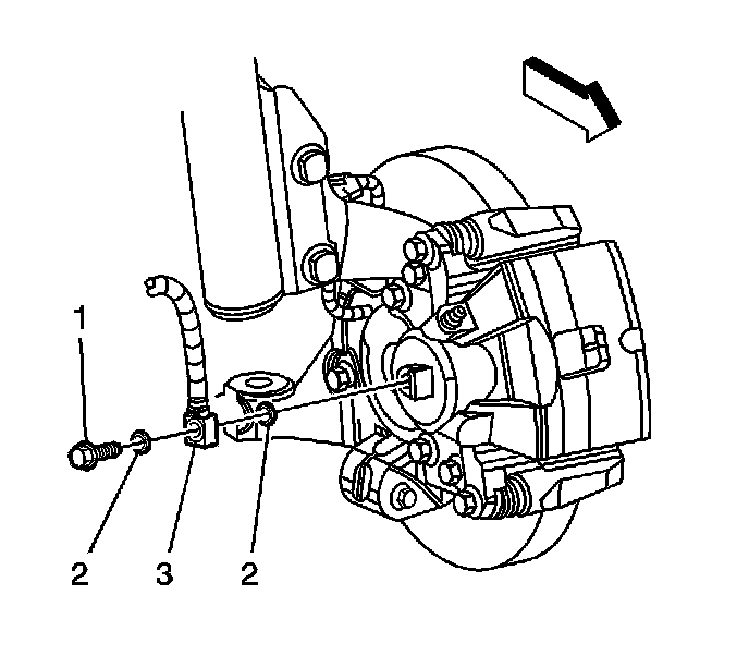 4. Install NEW copper brake hose gaskets (2) to the brake hose-to-caliper bolt (1) and to the brake hose (3).