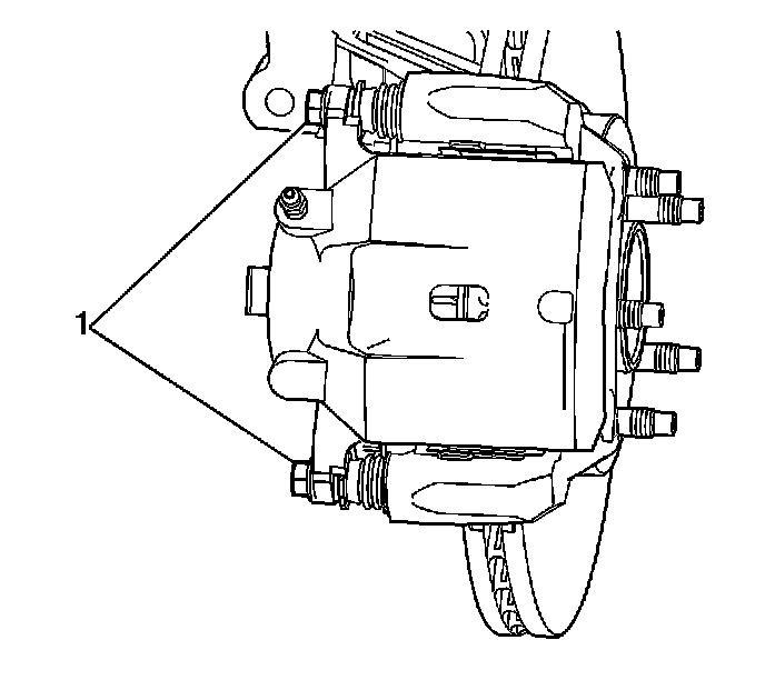 14. Remove the brake caliper guide pin bolts (1).