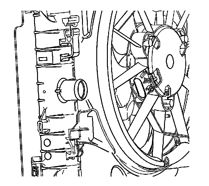 4. Remove the cooling fan assembly from the radiator by pushing up on the fan shroud to unsnap the retaining features. Position the cooling fan assembly away from the radiator.