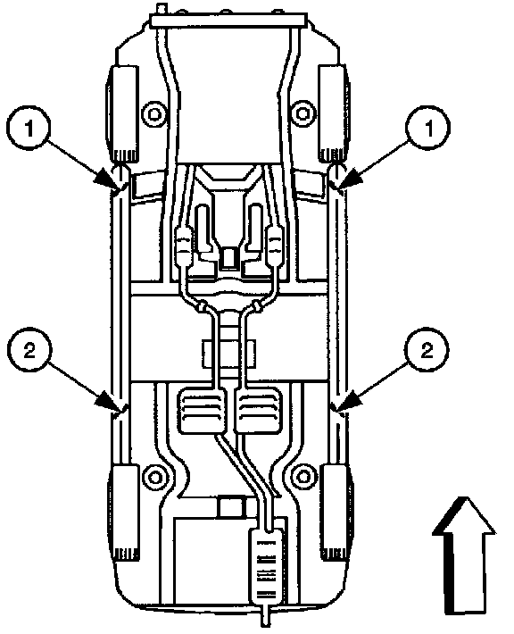 5. Raise vehicle on hoist until the tires are off the ground. Place front lift pads (1 in illustration) 170 mm (6.69 in) from front pinchweld flanges, rear lift pads (2) 55 mm (2.17 in) from rear pinchweld flanges.