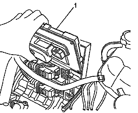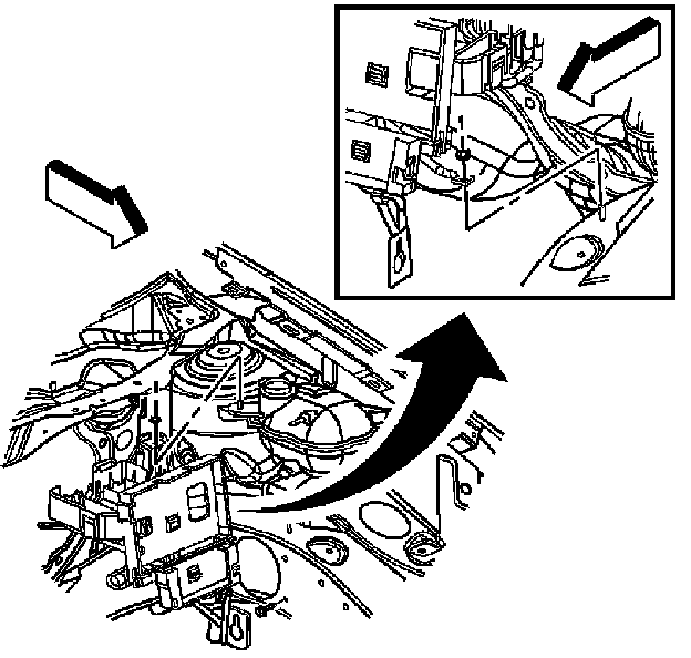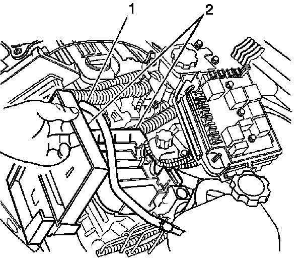 F. Release the engine wiring harness retainer (1), next to the powertrain control module (PCM). Reposition the wiring harness (2) toward the engine.