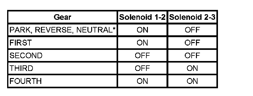 Important: The solenoid states are normally ON (1-2) and OFF (2-3) in the P, R, and N gears. However, these may change based on the vehicle speed and the throttle position.