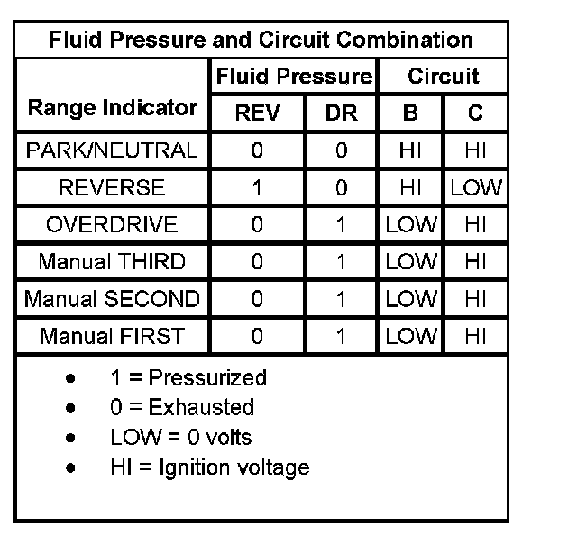 Each fluid pressure switch produces either an open or a ground to the TCM depending on the presence of fluid pressure at the switches. The sequence of open and closed switches produces a combination of voltage readings. The TCM monitors these readings.