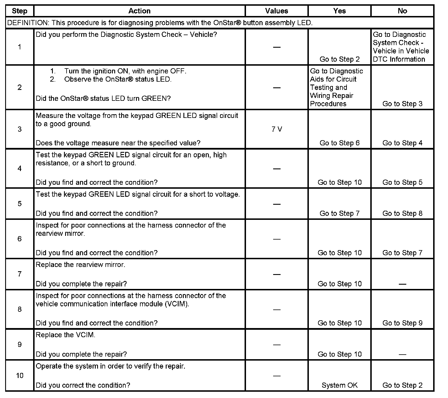 5. If the GREEN LED signal is shorted to voltage, then the OnStar(R) 3-button assembly has been damaged and must be replaced.