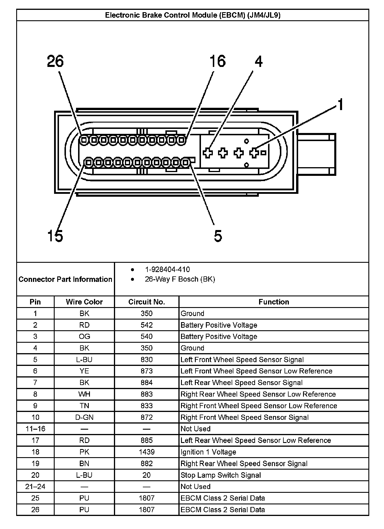 Electronic Brake Control Module (EBCM) With RPO Code JM4/JL9 26-Way Connector End View:
