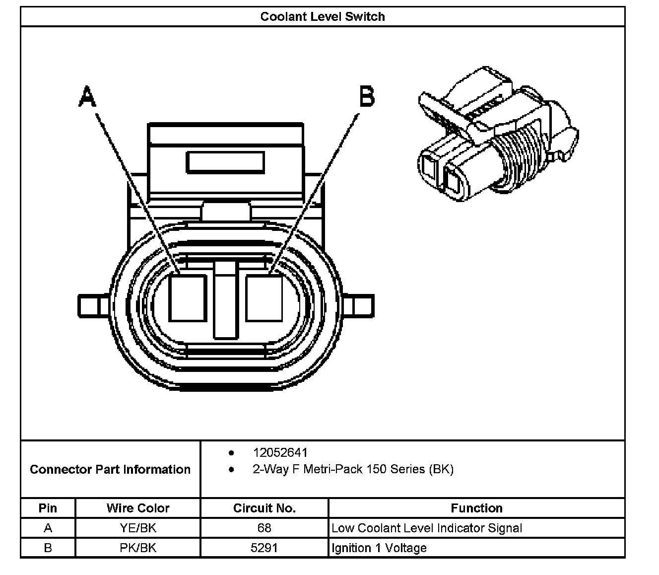 Coolant Level Switch 2-Way Connector End View: