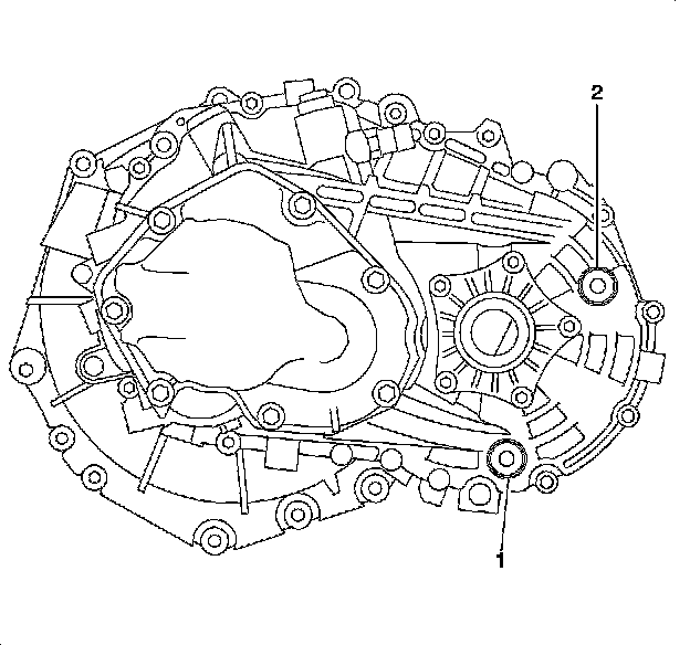 5. Using a funnel with a flexible spout or a quart bottle hand pump, add manual transaxle lubricant P/N 21018899 through the level plug (2) opening until fluid flows out.