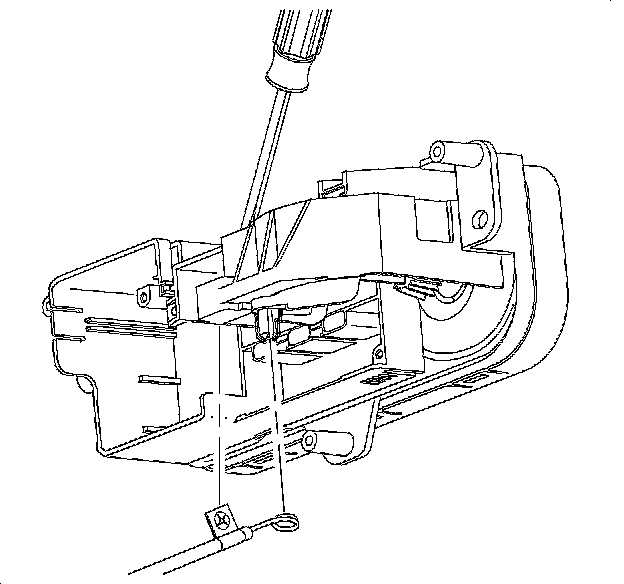 2. Install the cable eyelet onto the HVAC control assembly pin and install the cable housing flag into the slot in the HVAC control assembly until it engages the locking tab.