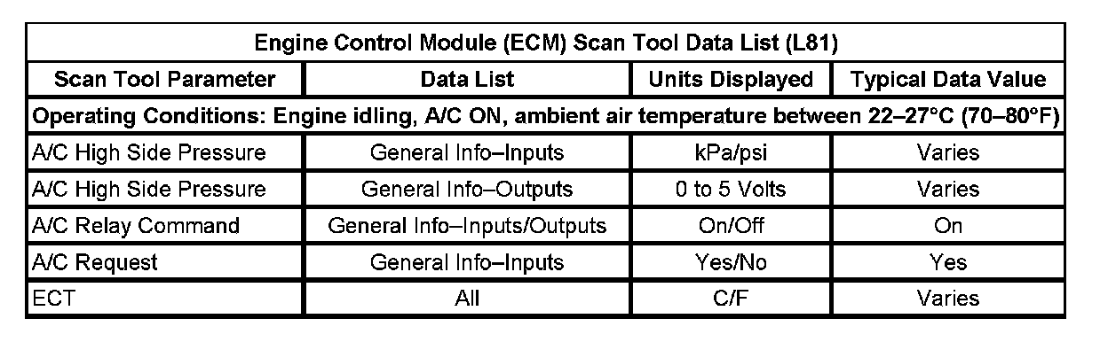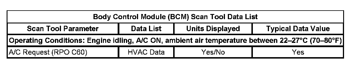 Use the Scan Tool Data Display Values and Definitions Information in order to assist in diagnosing the HVAC Control Assembly problems. Compare the vehicles actual scan tool data with the typical data display value table information. Use the data information in order to aid in understanding the nature of the problem when the vehicle does not match with the typical data display values.