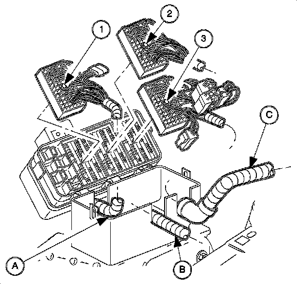 6. Route the I/P (C) and the forward lamp (B) harnesses into the fuse block case. Ensure that the tabs catch.