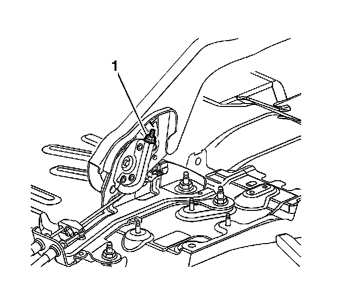 4. Release the tension from the park brake cable system at the front cable adjusting nut (1).Using ONLY HAND TOOLS, loosen the adjusting nut (1) completely to the end of the front cable threaded rod.