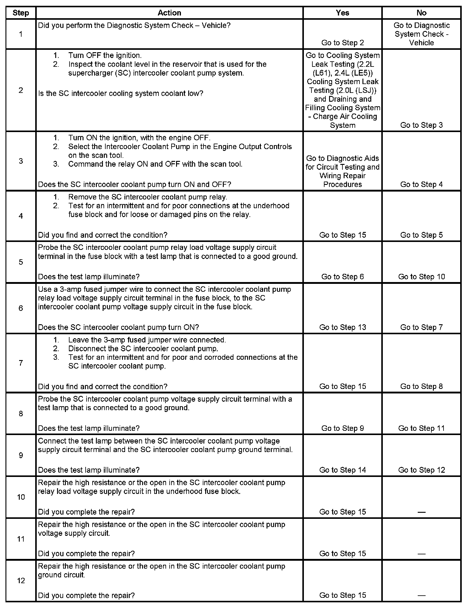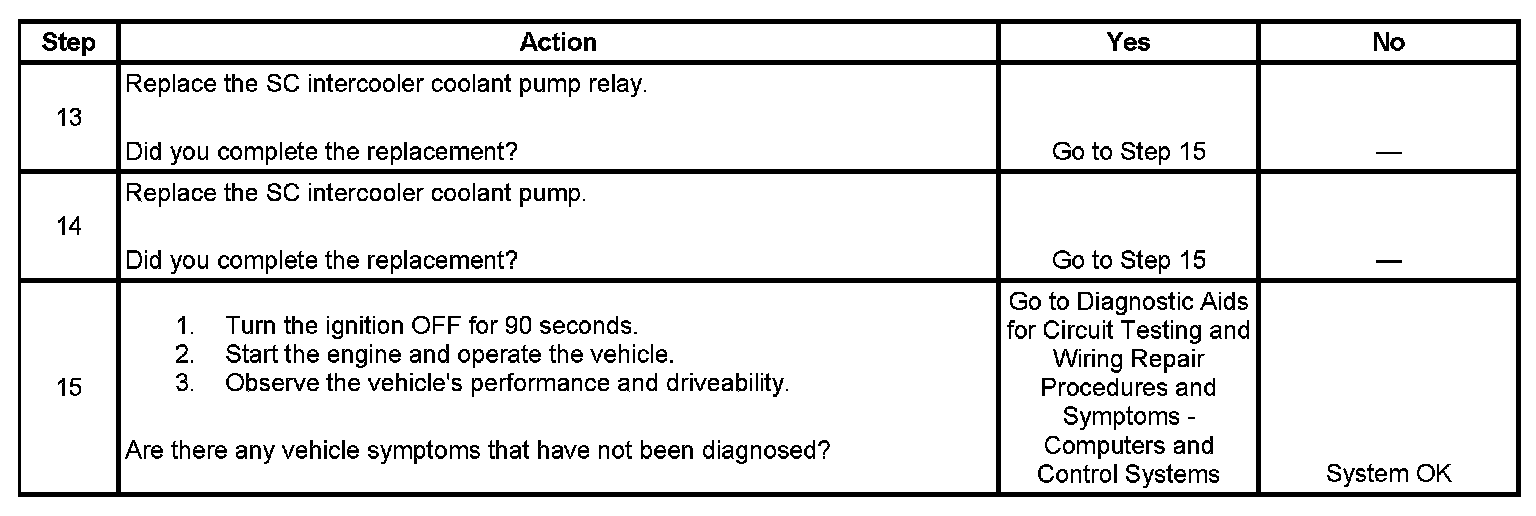 The SC intercooler coolant relay diagnosis is used to diagnose the load circuit supply voltage, the relay contacts, the relay load circuit which includes the SC intercooler coolant pump, and the ground for the SC intercooler coolant pump.
