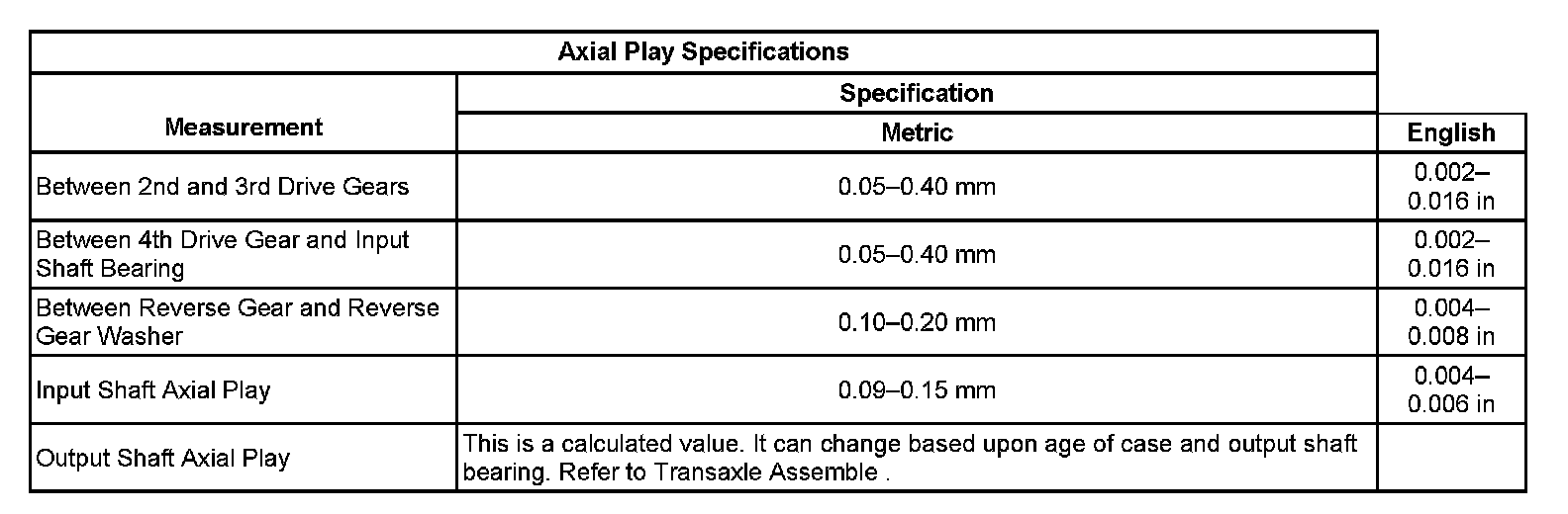 Axial Play Specifications: