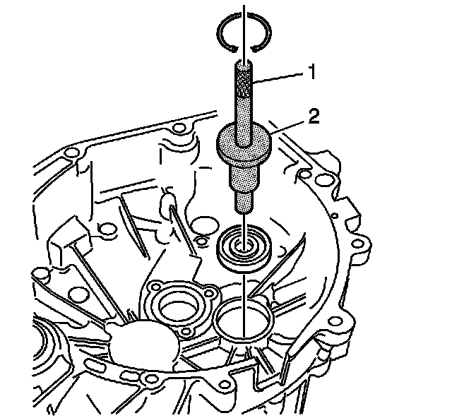6. Install a new differential bearing race to the transmission housing using the J 44385 (2) and the J 7079-2 (1).