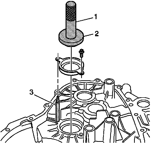 11. Install the output shaft bearing race and bolts using the J 44387-1 (2), J 44387-2 (3), and the J 7079-2 (1).