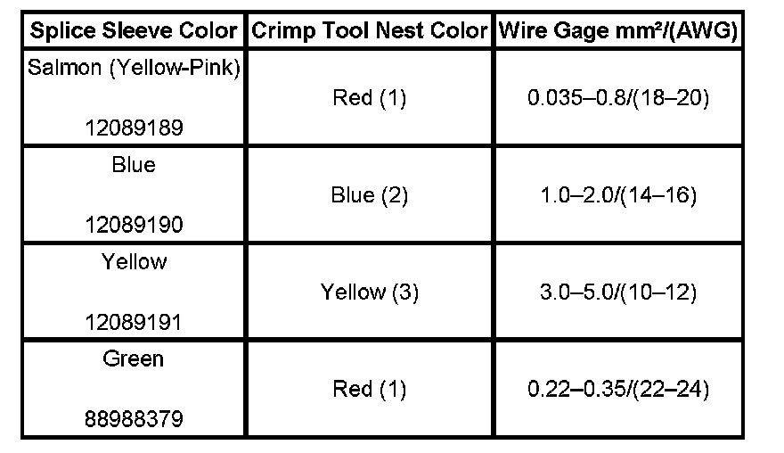 4. Select the proper duraseal splice sleeve according to the wire size. Refer to the above table at the beginning of the repair procedure for the color coding of the duraseal splice sleeves and the crimp tool nests.