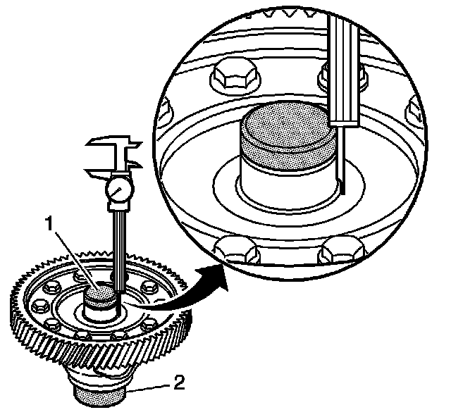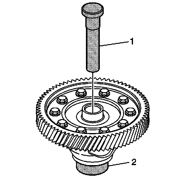 25. Insert the J 44388-3 (1) through the center of the differential until it rests firmly on the J 44388-4 (2).