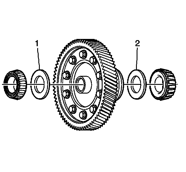 9. Make sure the left differential bearing race is fully seated into the transaxle case using the J 7079-2 (1) and the J 44385 (2).