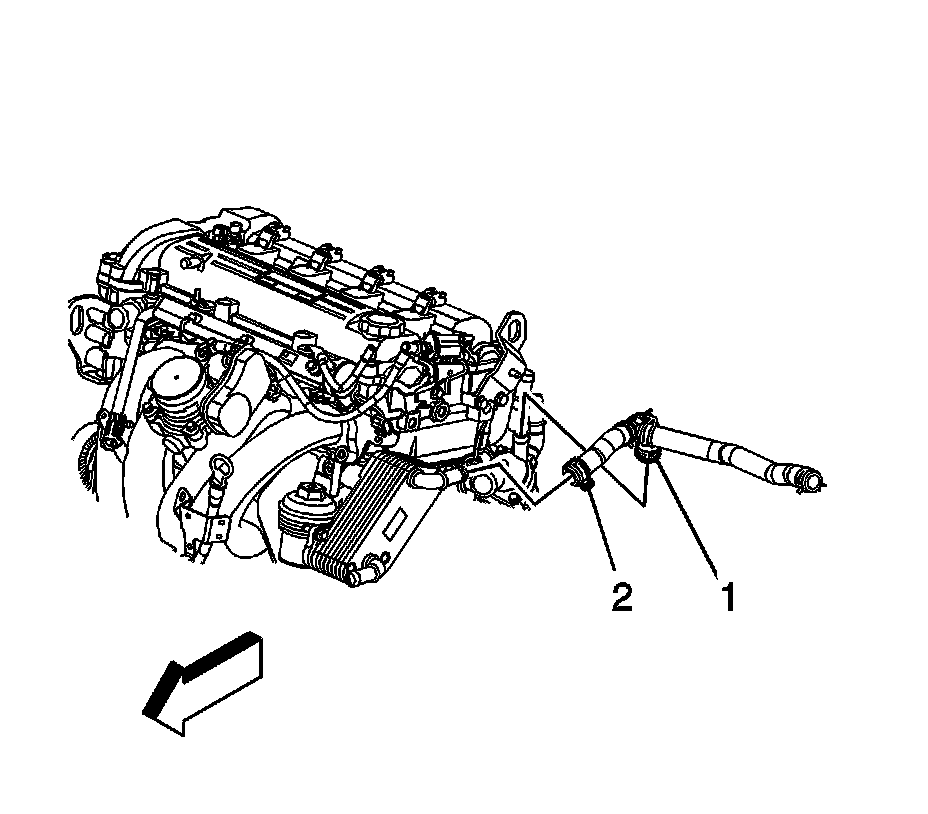5. Reposition the radiator surge tank outlet hose clamp (1) at the thermostat cover.