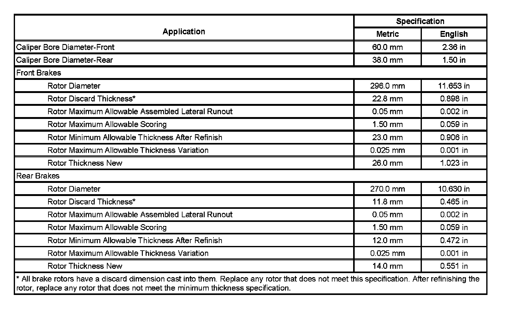 Disc Brake Component Specifications:
