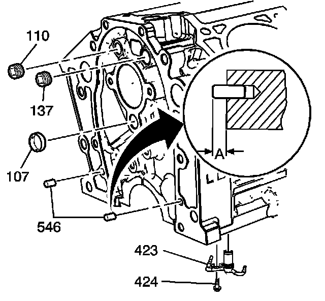 11. Install the front oil gallery plug (107) so that it is 1.5 mm (0.06 in) below flush of the engine block.