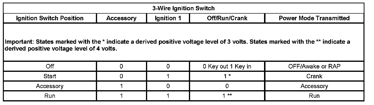 On vehicles that have several control modules connected by serial data circuits, one module is the power mode master (PMM). On this vehicle, the PMM is the body control module (BCM). The PMM receives 3 discrete ignition switch signals to differentiate which power mode will be sent over the Serial Data circuits. The 3-wire Ignition Switch table below illustrates the state of these inputs in correspondence to the ignition switch position: