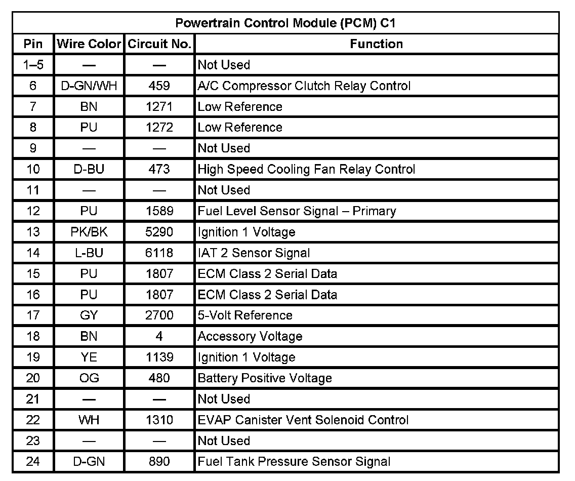Powertrain Control Module (PCM) C1 (Pin 1 To 24):