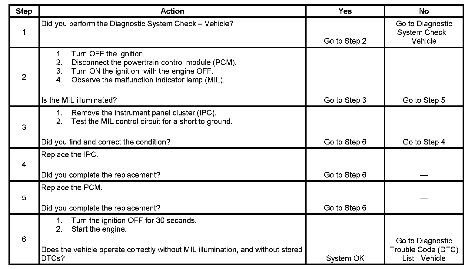 2. This step determines if the condition is with the MIL control circuit or the PCM.