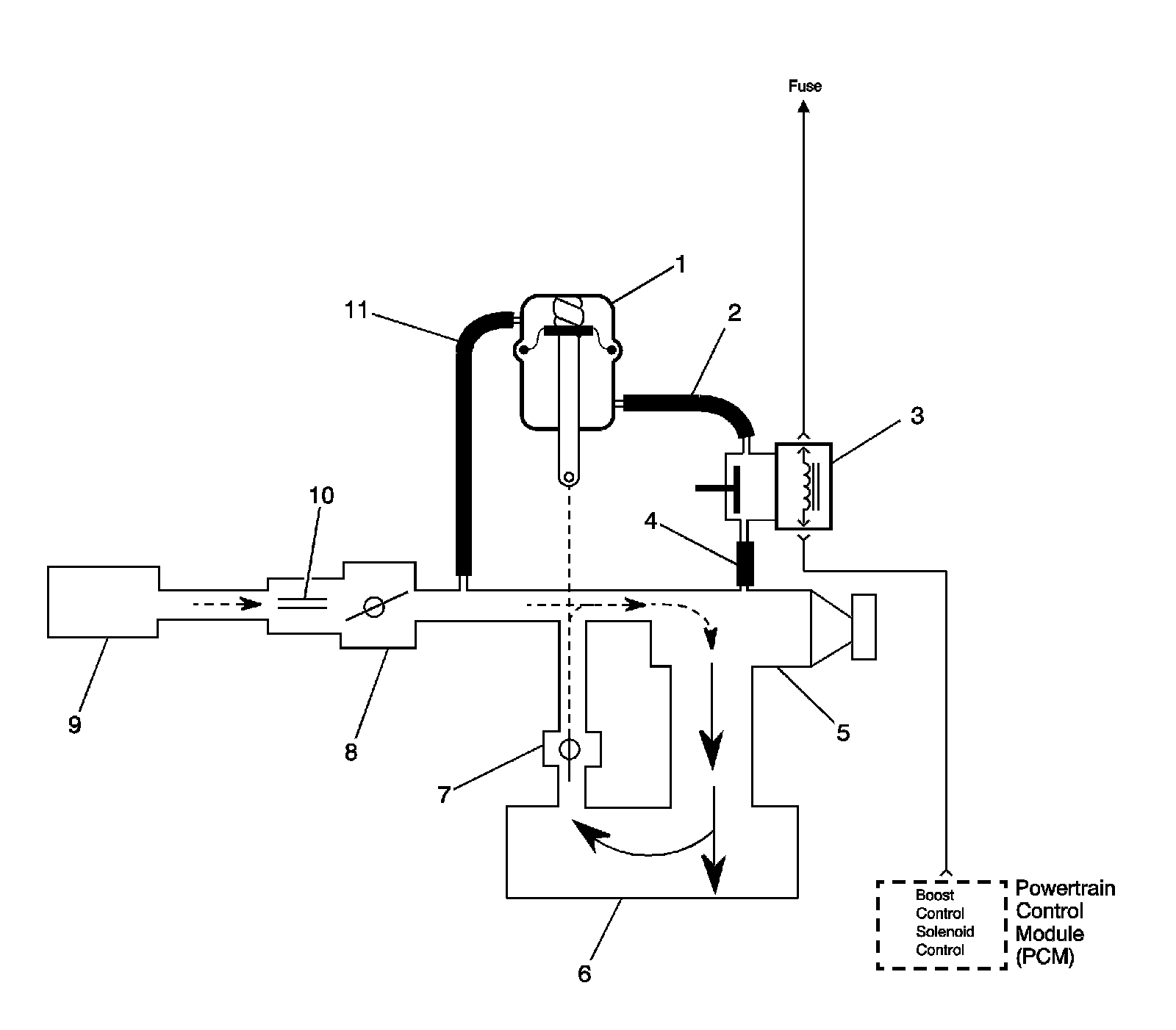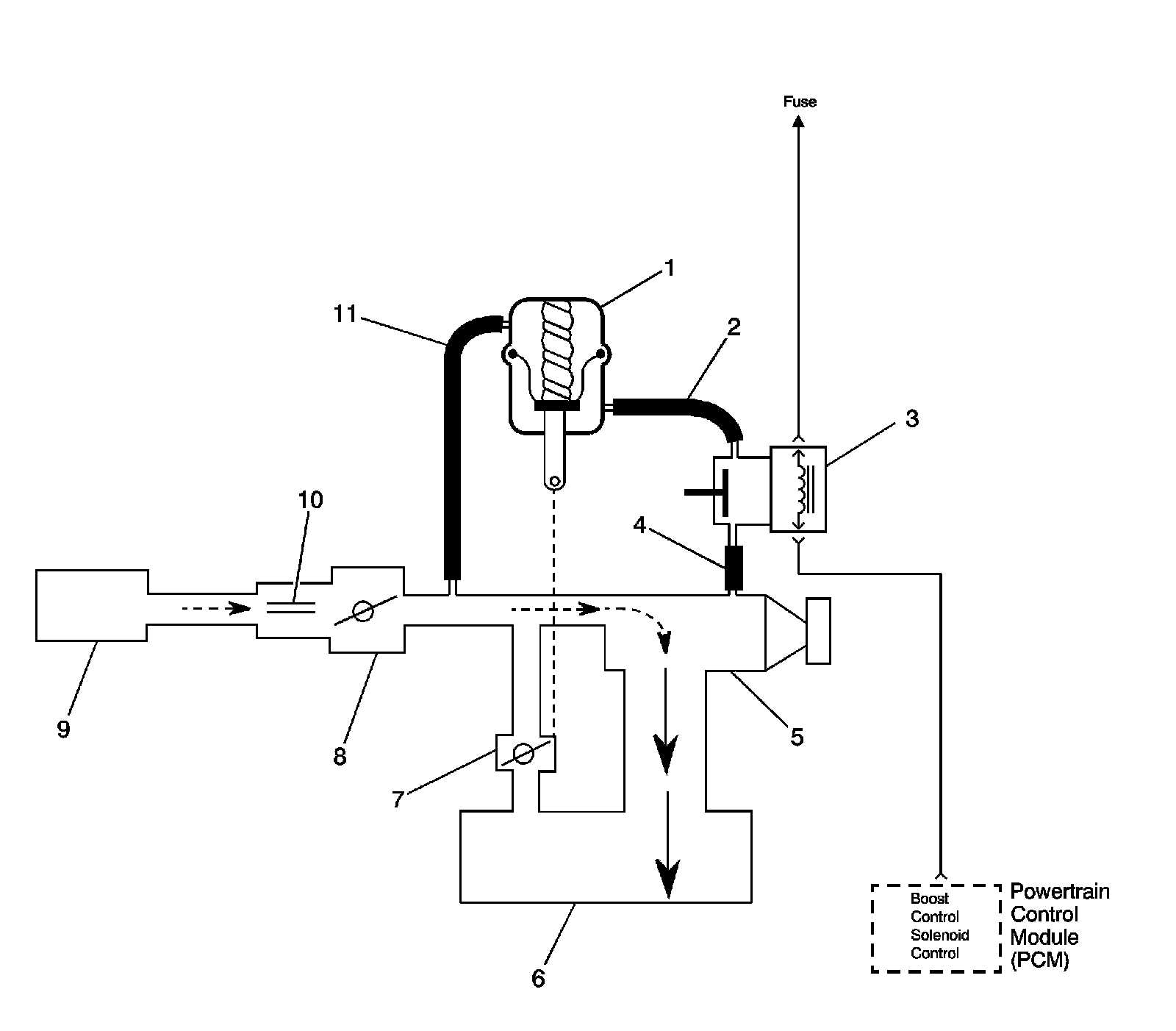 The boost control solenoid control circuit shorted to ground, boost control solenoid valve stuck closed or a restriction in the boost source or signal hoses will cause full boost to be commanded at all times and a possible overboost condition during high engine load situations.