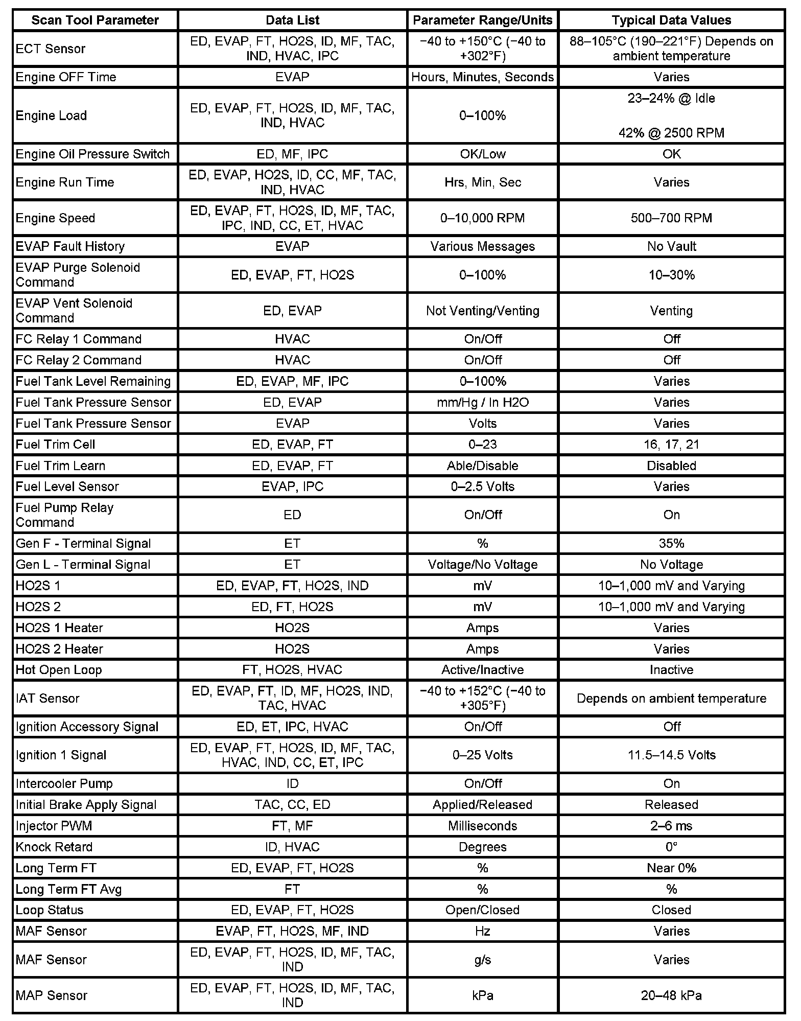 The column labeled Data List indicates where a parameter can be located on the scan tool. Refer to the scan tool operating manual for the exact locations of the data lists. The following is a description of each term listed: