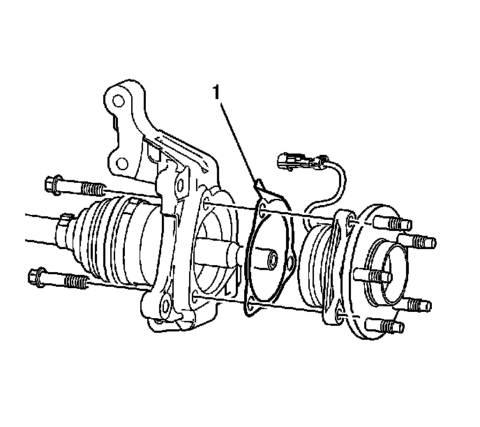 1. Install the wheel bearing/hub assembly and spacer (1) to the steering knuckle and wheel drive shaft. Position the spacer as noted prior to removal.