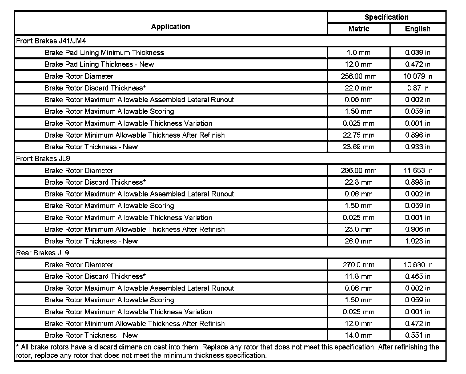 Disc Brake Component Specifications:
