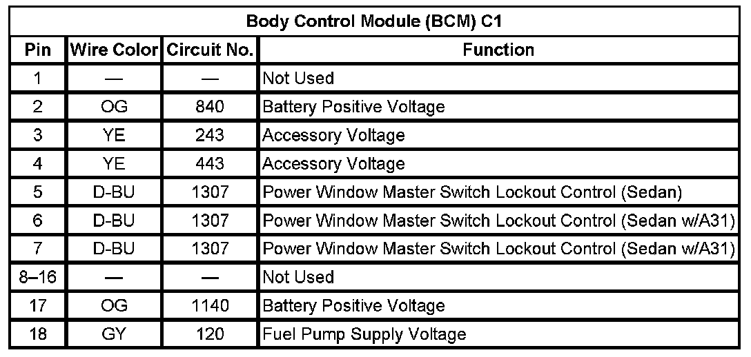 Body Control Module (BCM) C1 (Pin 1 To 18):