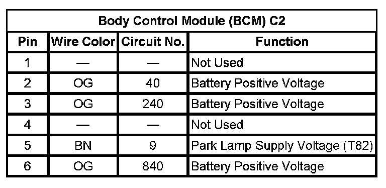 Body Control Module (BCM) C2 (Pin 1 To 6):