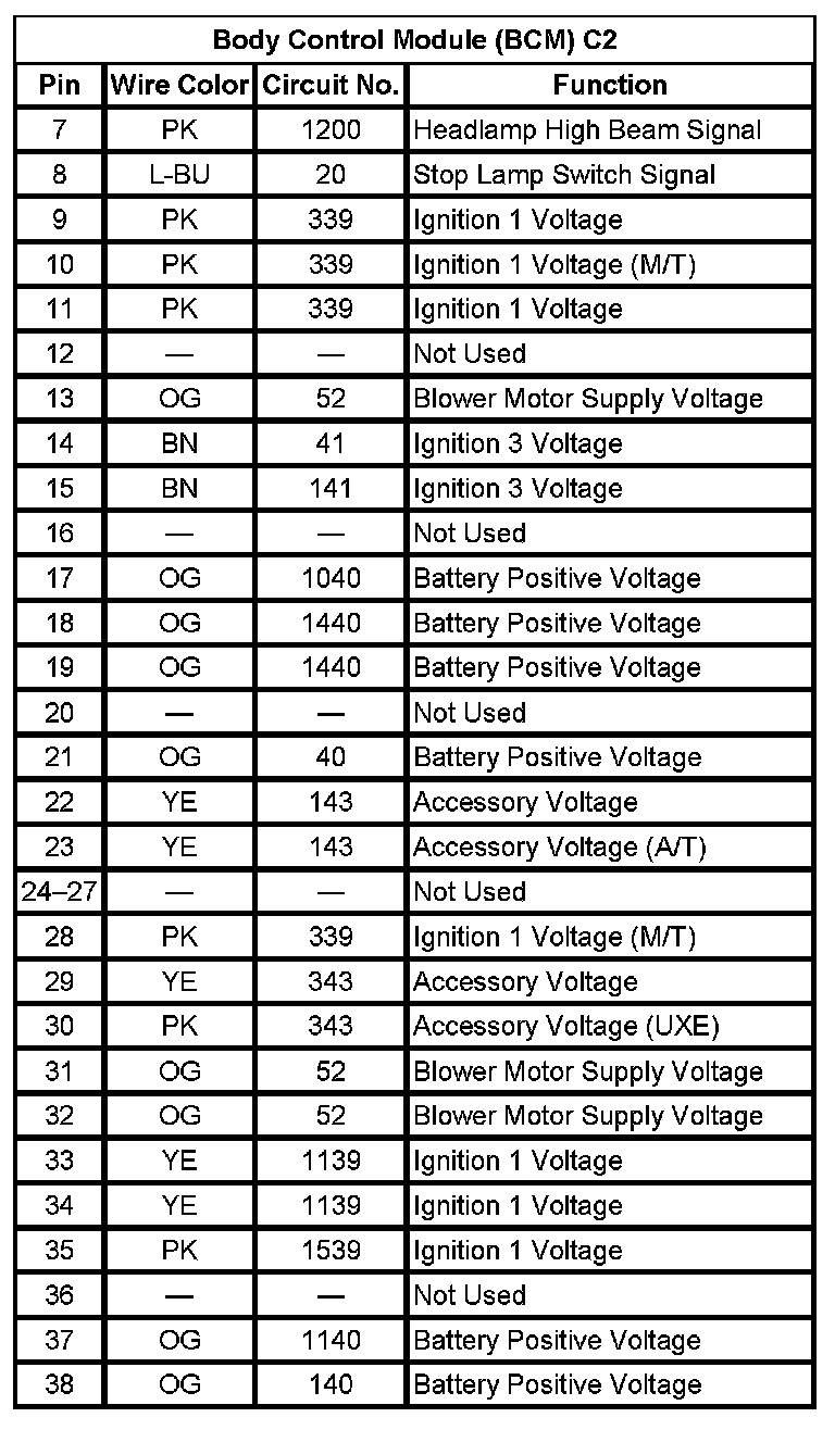 Body Control Module (BCM) C2 (Pin 7 To 38):