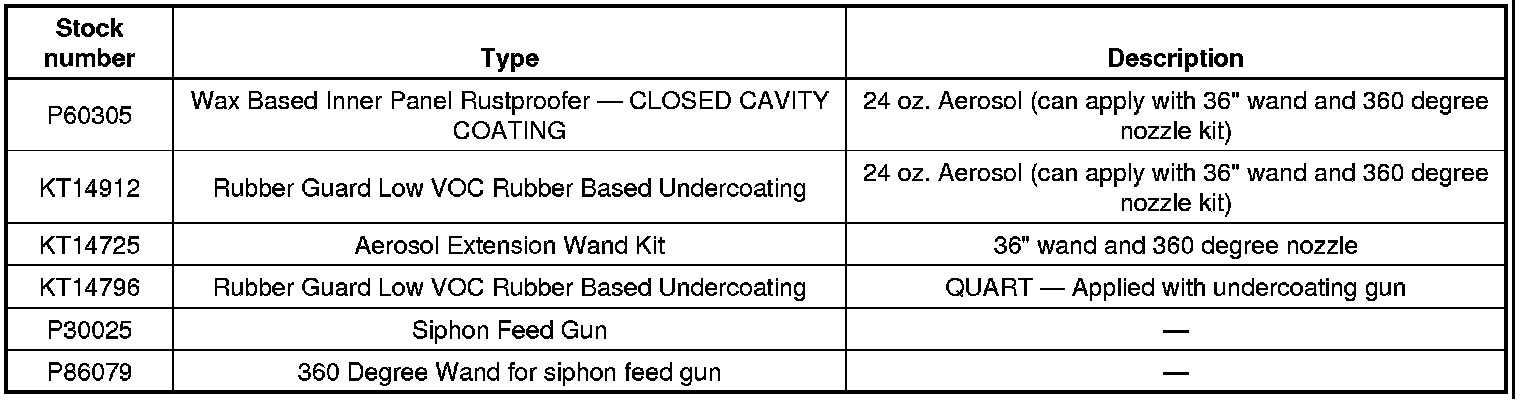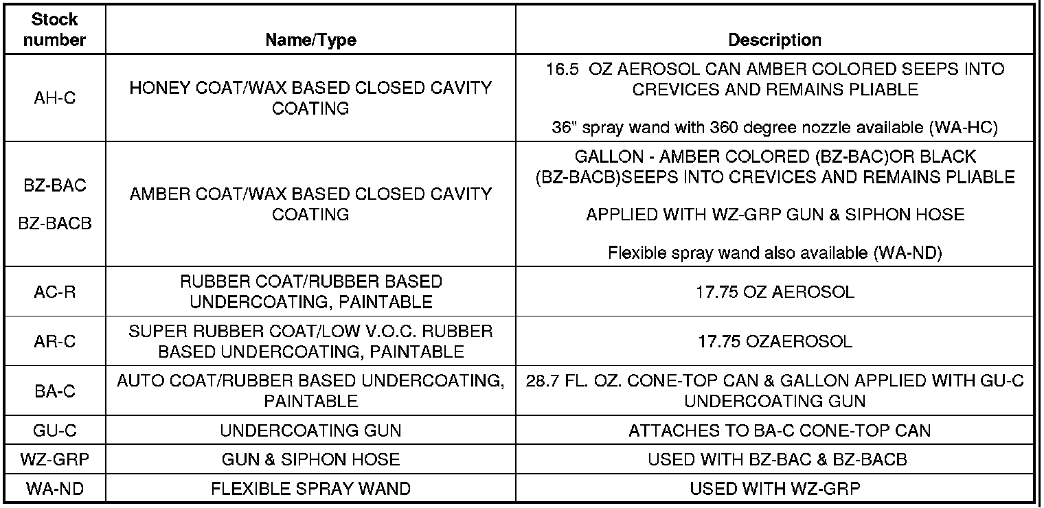 Below is a listing of Undercoat coatings and Closed Cavity coatings that GM believes to be reliable. While others may exist, we have found these products, or equivalents to them, can be used with satisfactory results. Always use these products according to their manufacturer's recommendations.