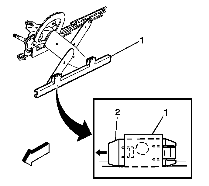 8. Disengage the window clips (2) from the window regulator sash channel (1).