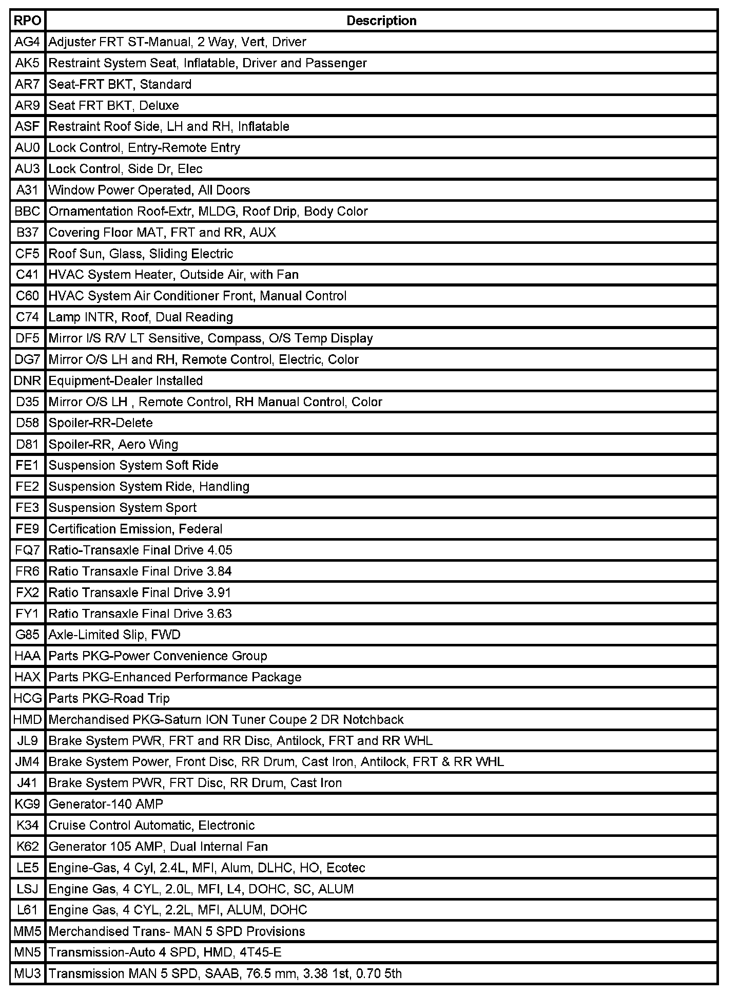 The following table provides the description of the Regular Production Option (RPO) codes that are available on the vehicle. The vehicle RPO list is printed on the Service Parts Identification Label.