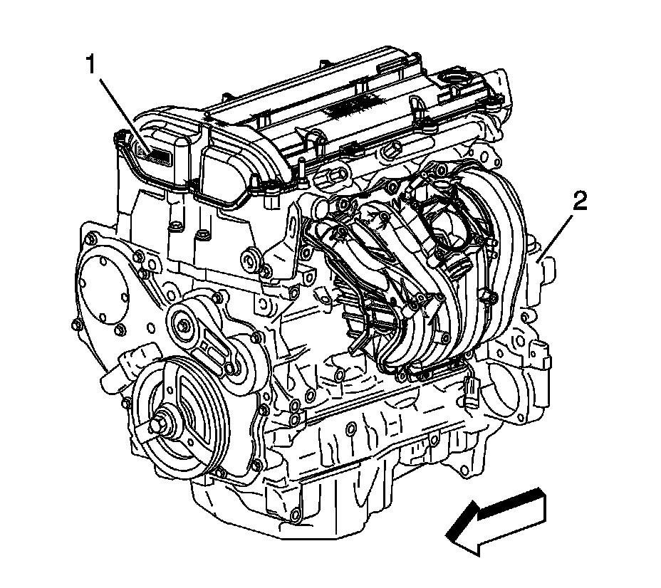 Identification can be made through the use of the Broadcast Code label on the engine front cover (1) and the use of the partial VIN etched on the oil filter bowl (2).