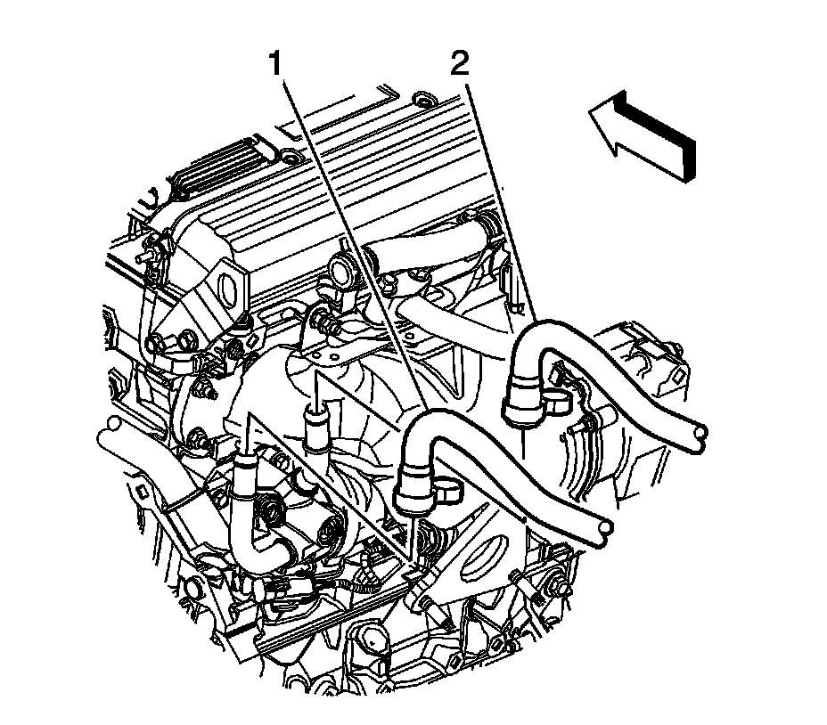79. Install the heater inlet and outlet hoses (1, 2) to the thermostat housing.