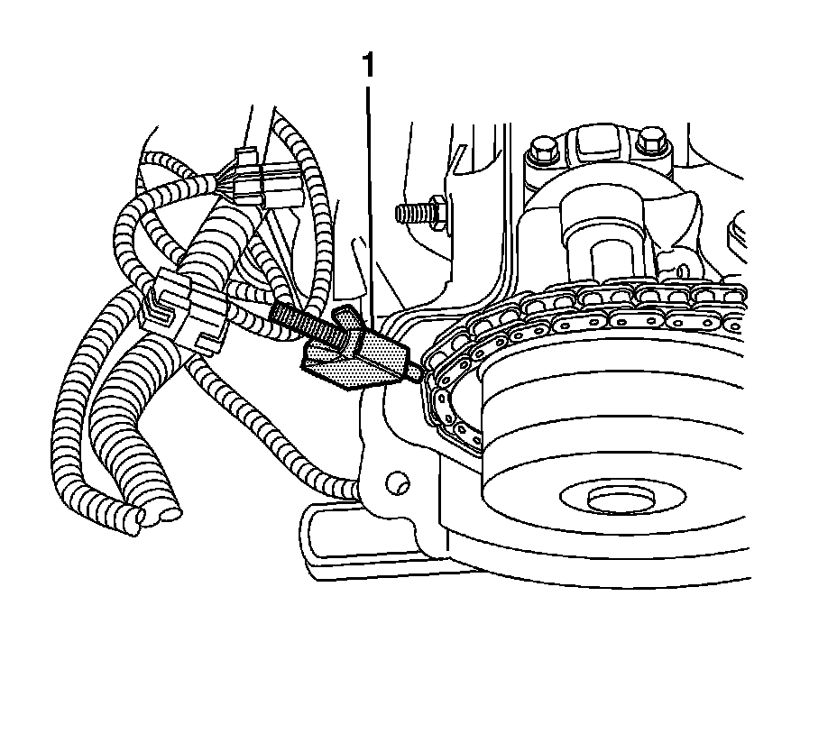 7. Install one of the tools (1) from the J44217 to the intake camshaft side of the timing chain assembly in order to retain the timing chain. Firmly tighten the nuts.