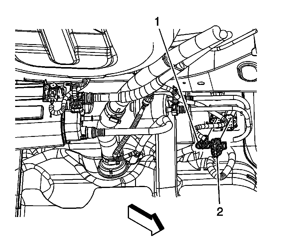 4. Disconnect the fuel pump module fuel feed (2) and return (1) line quick connect fittings from the fuel filter.