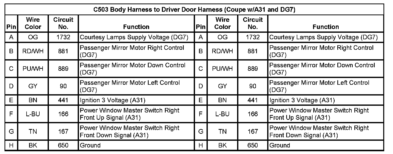 C503 Body Harness to Driver Door Harness (Coupe w/A31 and DG7)