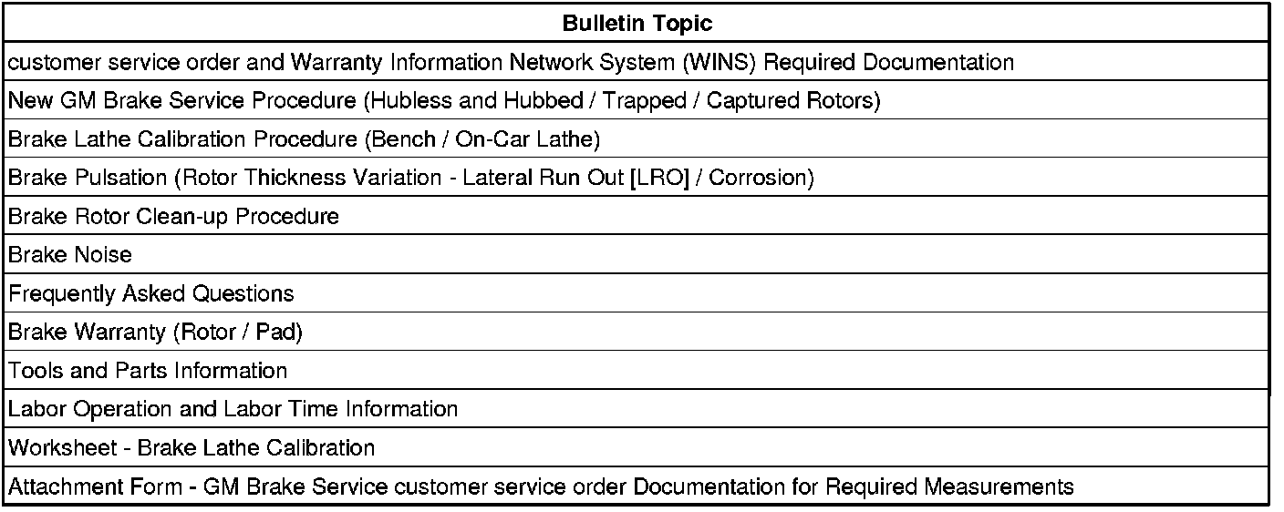 For your convenience, this bulletin updates and centralizes all GM's Standard Brake Service Procedures and Policy Guidelines for brake rotor and brake pad service and wear. For additional information, the Service Technical College lists a complete index of available Brake courses. This information can be accessed at www.gmtraining.com > resources > training materials > brakes courseware index.