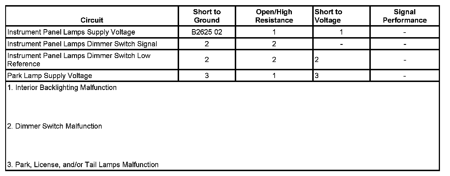 The body control module (BCM) receives an input from the instrument panel (I/P) dimmer switch. The BCM provides the I/P dimmer switch with battery voltage and a low reference. The I/P dimmer switch is a potentiometer that varies the input signal voltage to the BCM. This input determines the intensity level of the backlighting illumination. The driver may change intensity of the backlighting by positioning the I/P dimmer switch between the minimum and maximum settings. The BCM will default to full intensity if the input from the I/P dimmer switch is not within the specified values. The backlighting illumination intensity is controlled by the BCM by varying the pulse width modulation (PWM) voltage that feeds the dimming signal circuits of the individual lamps. All interior backlighting lamps are permanently grounded.