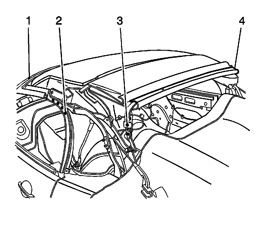 5. Disengage the J-hooks from the three 3 and four 4 bows of the headliner.
